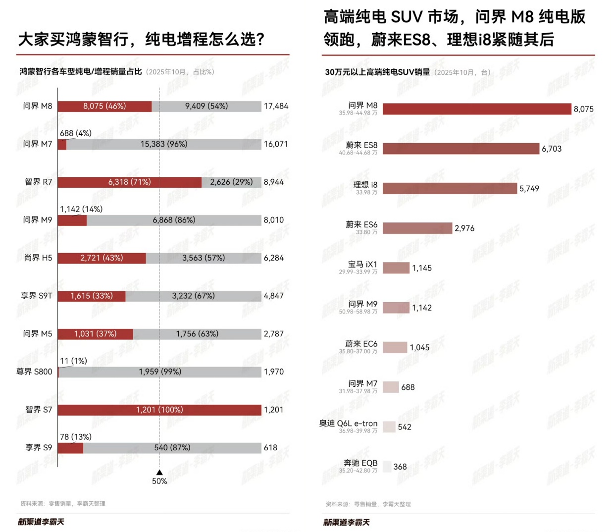 家庭出行的核心诉求之一,便是摆脱里程焦虑,让每一次出行都充满自由与从容。问界M8深刻理解这一需求,创新性地提供了"纯电"与"增程"两大动力选择,精准覆盖不同家庭用户的多元化出行场景。从最新交付数据来看,10月份问界M8共交付17484台,其中54%用户选择了增程版本,46%用户则青睐纯电版本,这一均衡分布充分印证了其双动力战略的市场认可度。